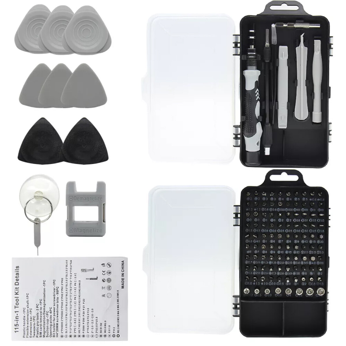 All-in-one design:Precision screwdriver set include 125 pieces, Including 98 x screwdriver bits, 1x plastic retractable handle + 1 extension bar set, 1 x flexible extension bar, 1 x tweezers, 1 x Hexagonal sleeve, 3x plastic pry tools, 1 x SIM card removal tool+1 x suction cup set, 8 x triangle pry tools,1 x Magnetization