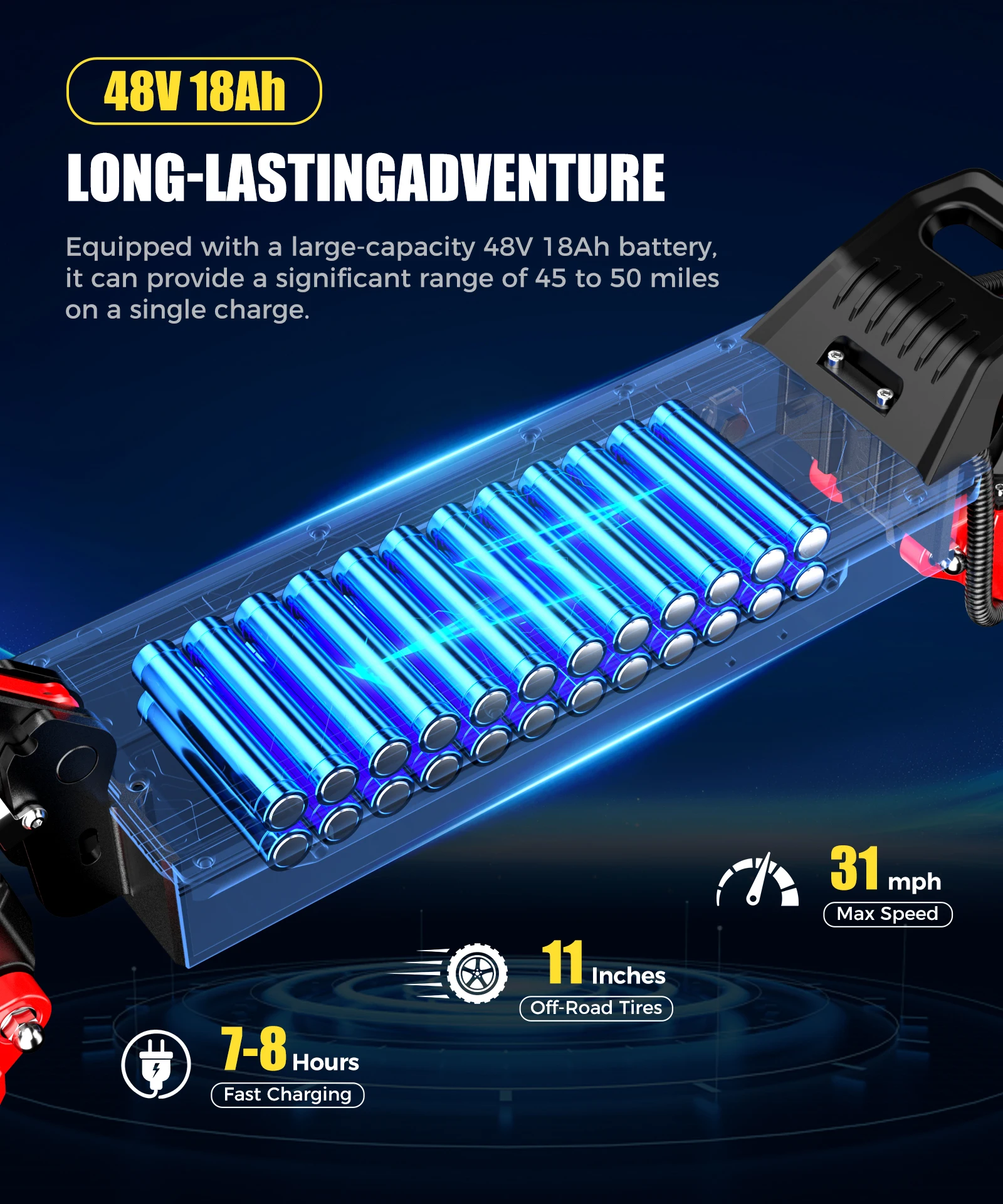 Powerful Performance The J15 MAX electric scooter, powered by a 1600W peak motor, delivers speeds up to 50 KM/h and a 33 miles range with a 48V 18AH battery, perfect for commuters and off-road enthusiasts.